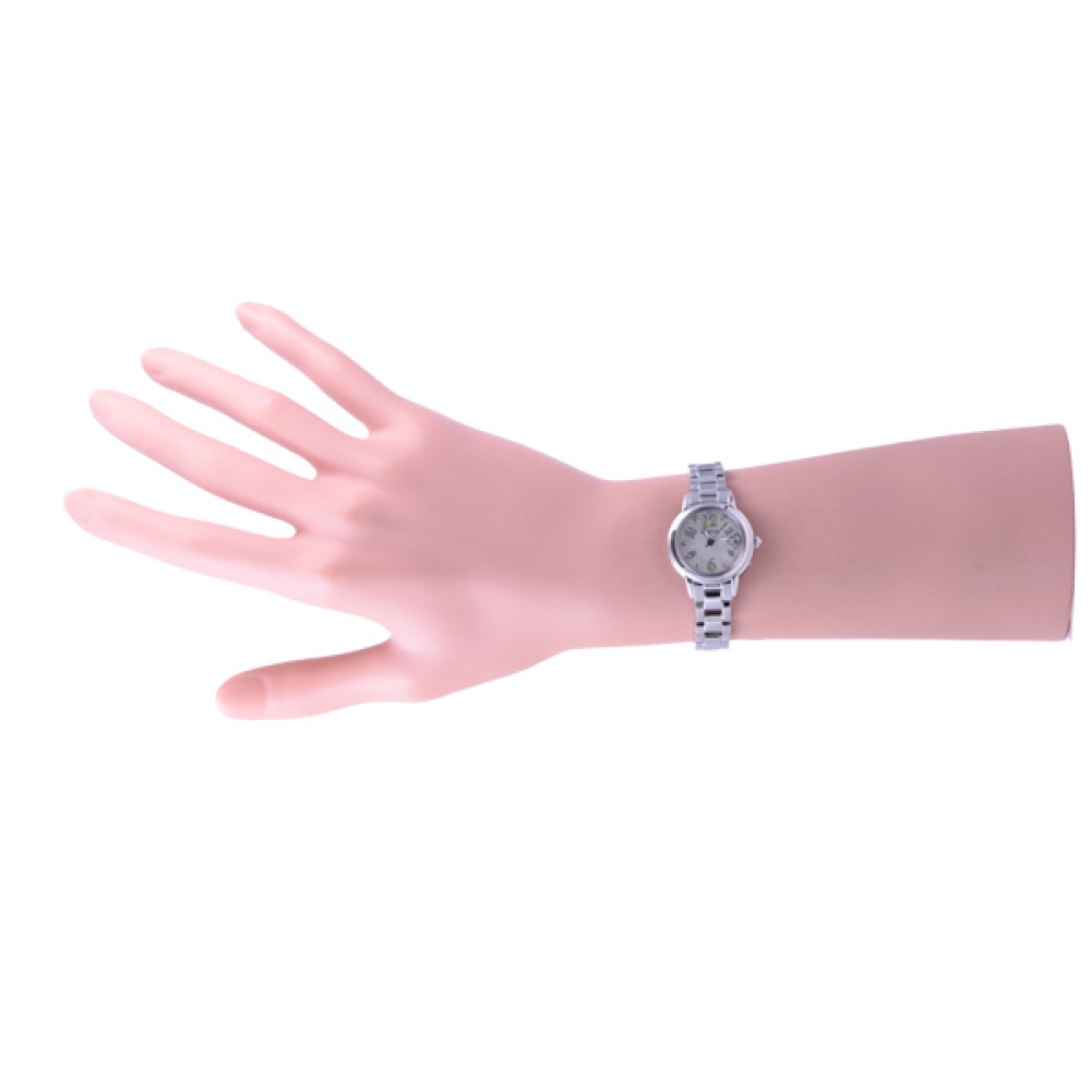 CITIZEN WICCA KL0-413-11 - ladies watch produced by Citizen. It is equipped with Japanese solar quartz movement and H0F8 calibre. Stainless steel case of round shape. Case dimensions are 25.5 mm. in diameter and 7.2 mm. in thickness. The dial of this Citizen watch is white. Display type: analog. This timepiece has mineral glass. Stainless steel band, band color: silver. 50 m. water resistance. The watch is from Wicca collection. The following features are equipped: antimagnetic, date, perpetual calendar, radio controlled.