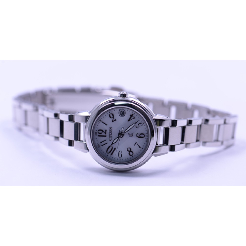 CITIZEN XC ES8030-58A - ladies watch made by Citizen. It is equipped with Japanese solar quartz movement and H058 calibre. Stainless steel case of round shape. Case dimensions are 25 mm. in diameter and 7.2 mm. in thickness. The dial of this Citizen watch is silver. Display type: analog. This timepiece has sapphire, antireflection coating glass. Stainless steel, hard coating band, band color: silver. 100 m. water resistance. The watch is from xC collection. The following features are equipped: antimagnetic, date, perpetual calendar, radio controlled, glowing hands.