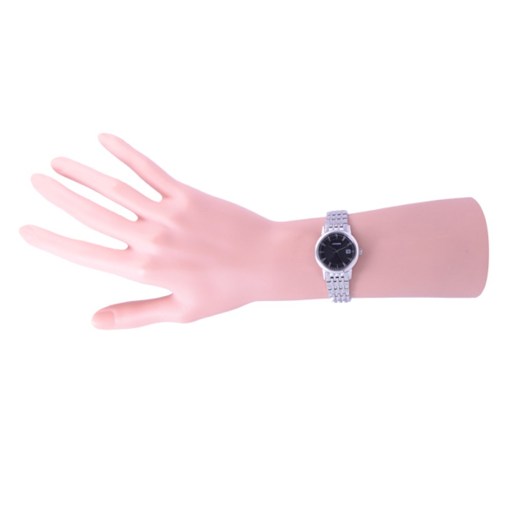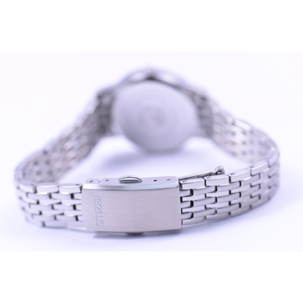CITIZEN COLLECTION EW1580-50G - ladies watch made by Citizen. It has Japanese solar quartz movement and E011 calibre. Stainless steel case of round shape. Case dimensions are 27 mm. in diameter and 7.3 mm. in thickness. The dial of this Citizen watch is black. Display type: analog. This timepiece has sapphire glass. Stainless steel band, band color: silver. 30 m. water resistance. The watch is from Citizen Collection collection. The following features are equipped: date.