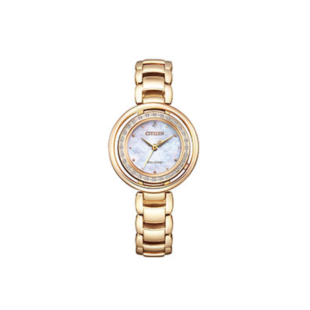 Citizen L Round Collection EM0902-53D - ladies watch produced by Citizen. It is equipped with Japanese solar quartz movement and E031 calibre. Stainless steel, gold plated case of round shape. Case dimensions are 30.5 mm. in diameter and 7.4 mm. in thickness. The dial of this Citizen watch is mother of pearl. Display type: analog. This timepiece has sapphire glass. Stainless steel, gold plated band, band color: gold. 50 m. water resistance. The watch is from Citizen L collection. The following features are equipped: diamond set.