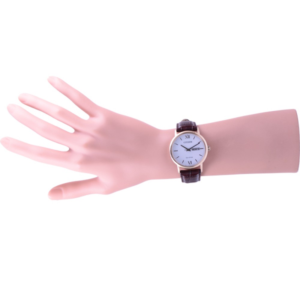 CITIZEN COLLECTION BM9012-02A - men's watch made by Citizen. It has Japanese solar quartz movement and E101 calibre. Stainless steel, gold plated case of round shape. Case dimensions are 37 mm. in diameter and 7.9 mm. in thickness. The dial of this Citizen watch is white. Display type: analog. This timepiece has sapphire glass. Leather band, band color: brown. 30 m. water resistance. The watch is from Citizen Collection collection. The following features are equipped: date, day.