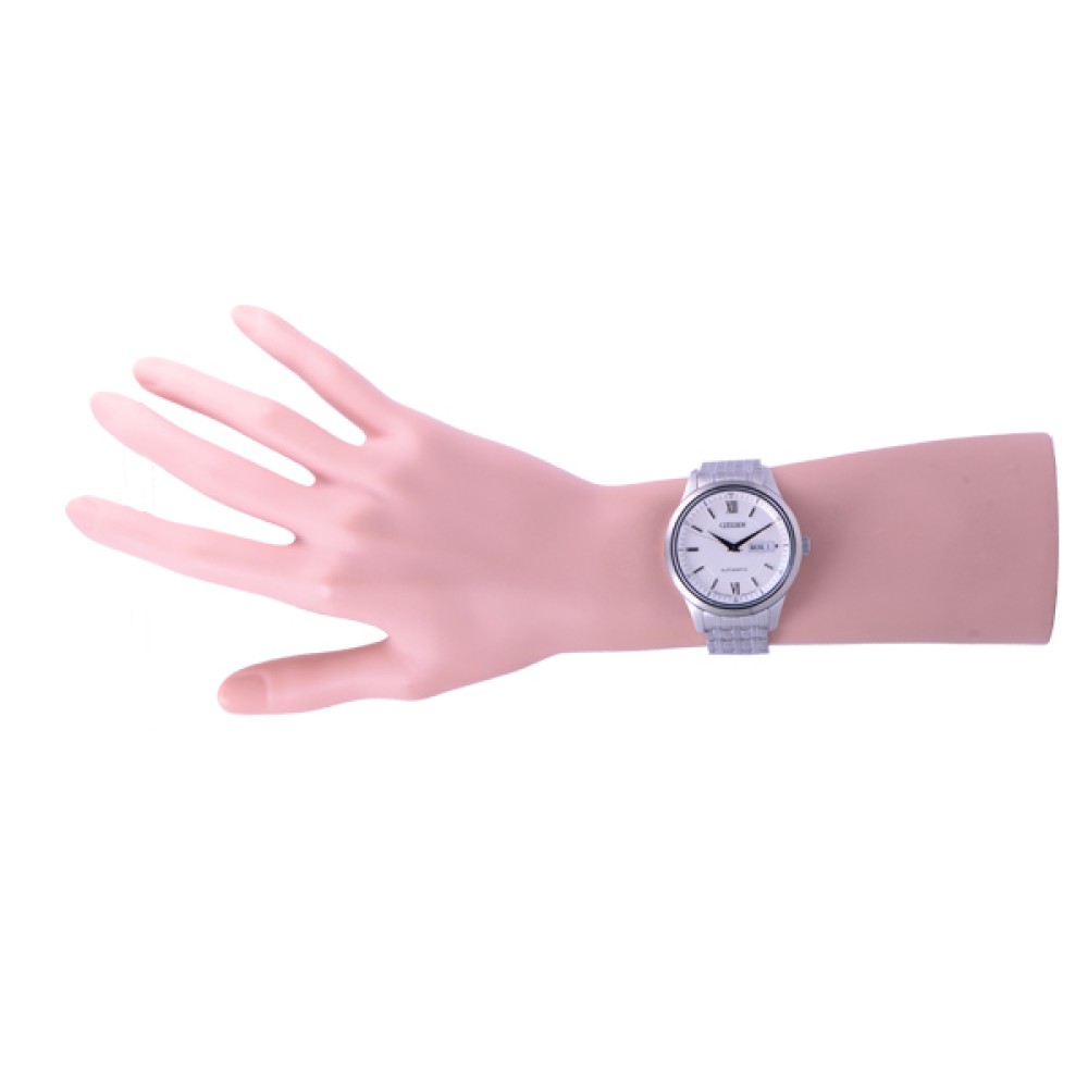 CITIZEN COLLECTION NY4050-54A - men's watch made by Citizen. It is equipped with Japanese automatic movement and 8200 calibre. Stainless steel case of round shape. Case dimensions are 40 mm. in diameter and 10.7 mm. in thickness. The dial of this Citizen watch is white, silver. Display type: analog. This timepiece has sapphire glass. Stainless steel band, band color: silver. 50 m. water resistance. The watch is from Citizen Collection collection. The following features are equipped: date, day.