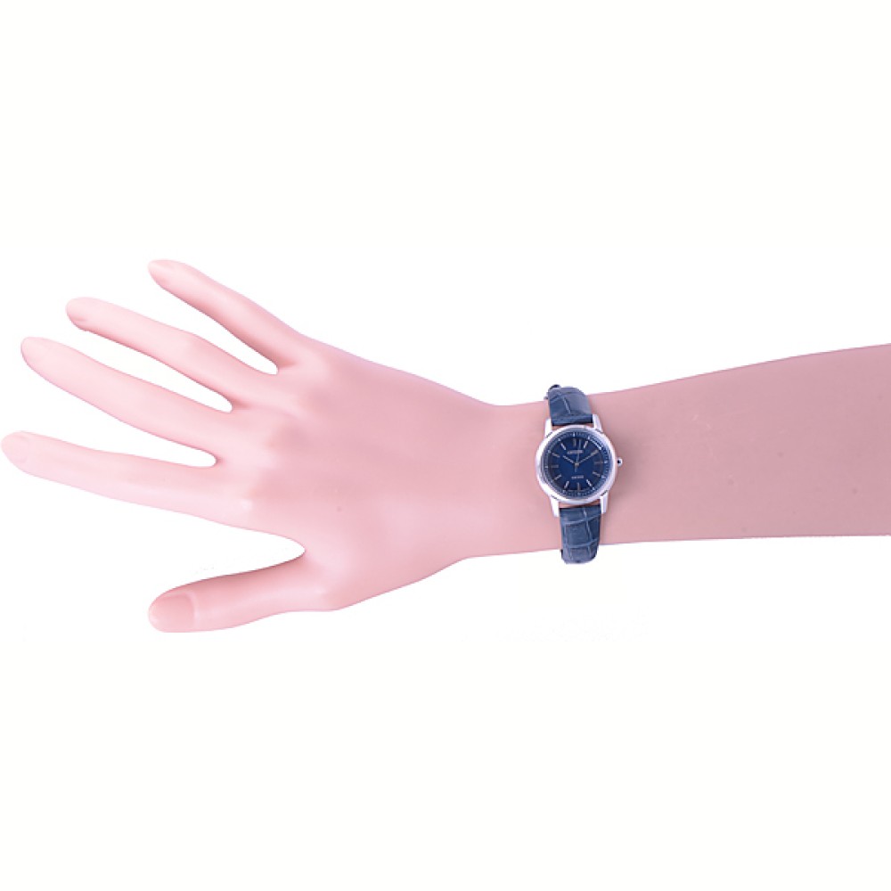 CITIZEN EXCEED EX2071-01L - ladies watch manufactured by Citizen. It is equipped with Japanese solar quartz movement and B035 calibre. Titanium, hard coating case of round shape. Case dimensions are 26 mm. in diameter and 6.4 mm. in thickness. The dial of this Citizen watch is blue. Display type: analog. This timepiece has sapphire, antireflection coating glass. Crocodile leather band, band color: blue. 50 m. water resistance. The watch is from Exceed collection.