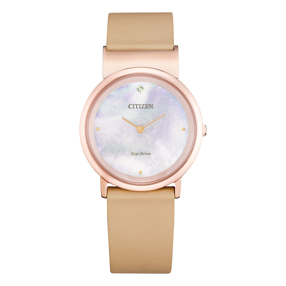 Citizen L Ambiluna EG7079-10Y - ladies watch produced by Citizen. It is equipped with Japanese solar quartz movement and G620 calibre. Titanium, gold plated case of round shape. Case dimensions are 31 mm. in diameter and 6 mm. in thickness. The dial of this Citizen watch is mother of pearl. Display type: analog. This timepiece has sapphire glass. Leather band, band color: beige. 50 m. water resistance. The watch is from Citizen L collection. The following features are equipped: diamond set.