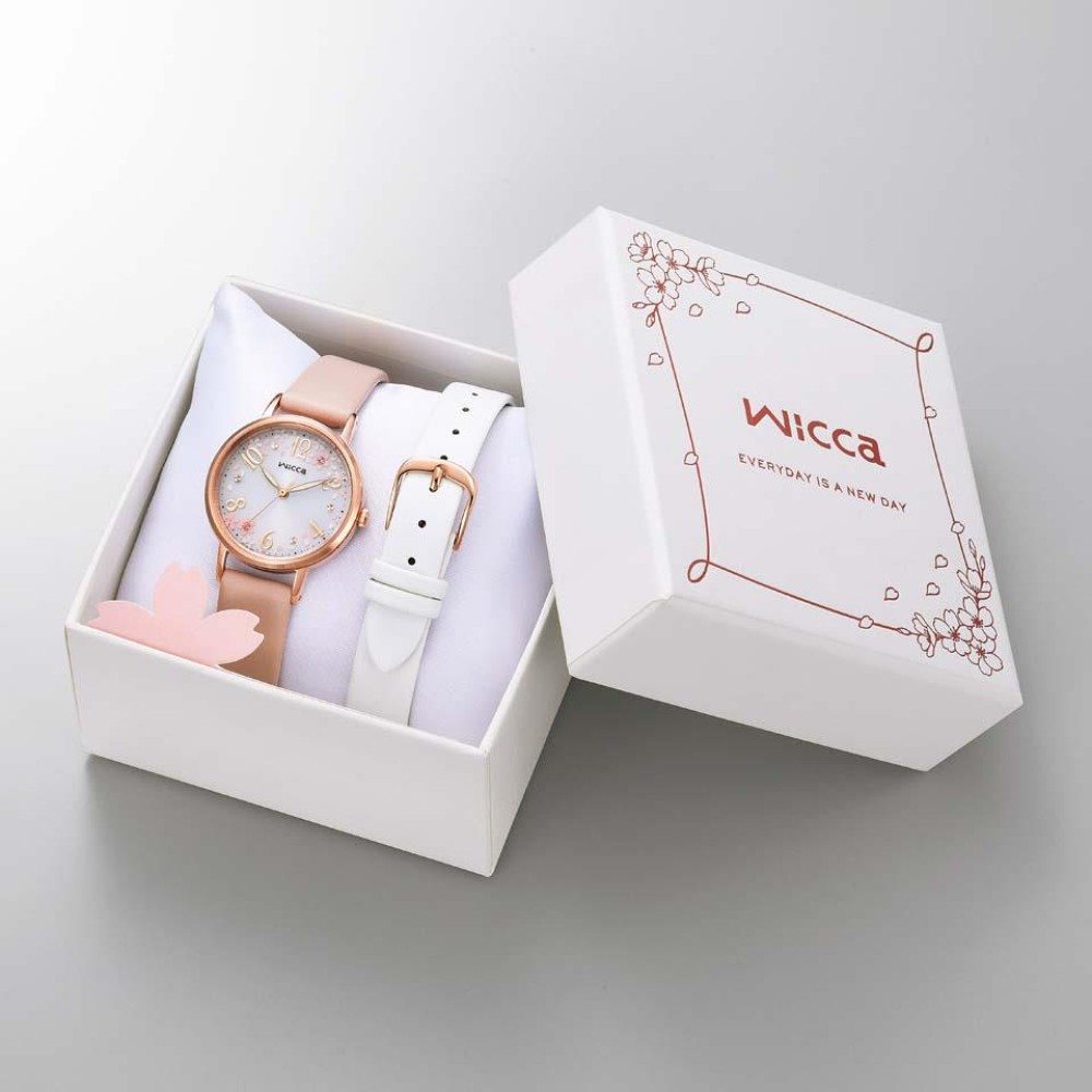 Citizen Wicca Haruka Fukuhara Collaboration Model KP5-166-12 - ladies watch made by Citizen. It has Japanese solar quartz movement and E031 calibre. Stainless steel, gold plated case of round shape. Case dimensions are 30.2 mm. in diameter and 7.5 mm. in thickness. The dial of this Citizen watch is white. Display type: analog. This timepiece has mineral glass. Leather band, band color: pink, white. 50 m. water resistance. The watch is from Wicca collection. The following features are equipped: crystal set.