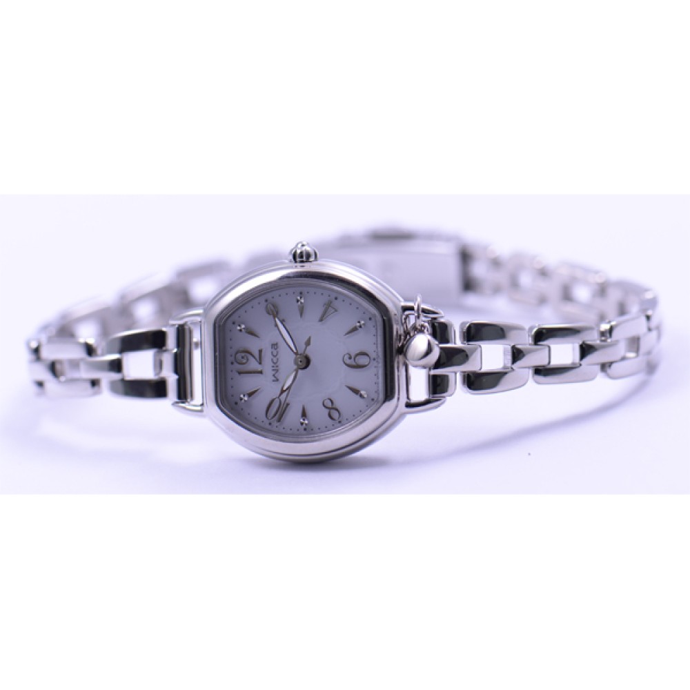 CITIZEN WICCA KP2-515-11 - ladies watch made by Citizen. It has Japanese solar quartz movement and E031 calibre. Stainless steel case of tonneau shape. Case dimensions are 23.5 mm. in diameter and 6.7 mm. in thickness. The dial of this Citizen watch is silver, white. Display type: analog. This timepiece has mineral glass. Stainless steel band, band color: silver. 50 m. water resistance. The watch is from Wicca collection. The following features are equipped: crystal set.