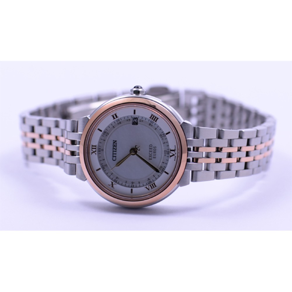 CITIZEN EXCEED ES1054-58W - ladies watch produced by Citizen. It has Japanese solar quartz movement and H240 calibre. Stainless steel, hard coating, gold plated case of round shape. Case dimensions are 28.5 mm. in diameter and 7.6 mm. in thickness. The dial of this Citizen watch is white. Display type: analog. This timepiece has sapphire, super clear coating glass. Stainless steel, hard coating, gold plated band, band color: silver, gold. 50 m. water resistance. The watch is from Exceed collection. The following features are equipped: radio controlled, antimagnetic, world time, date, perpetual calendar.