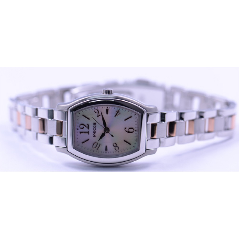 CITIZEN WICCA KH8-730-93 - ladies watch manufactured by Citizen. It is equipped with Japanese solar quartz movement and E031 calibre. Stainless steel case of tonneau shape. Case dimensions are 24 mm. in diameter and 7.6 mm. in thickness. The dial of this Citizen watch is pink. Display type: analog. This timepiece has mineral glass. Stainless steel band, band color: silver. 50 m. water resistance. The watch is from Wicca collection.