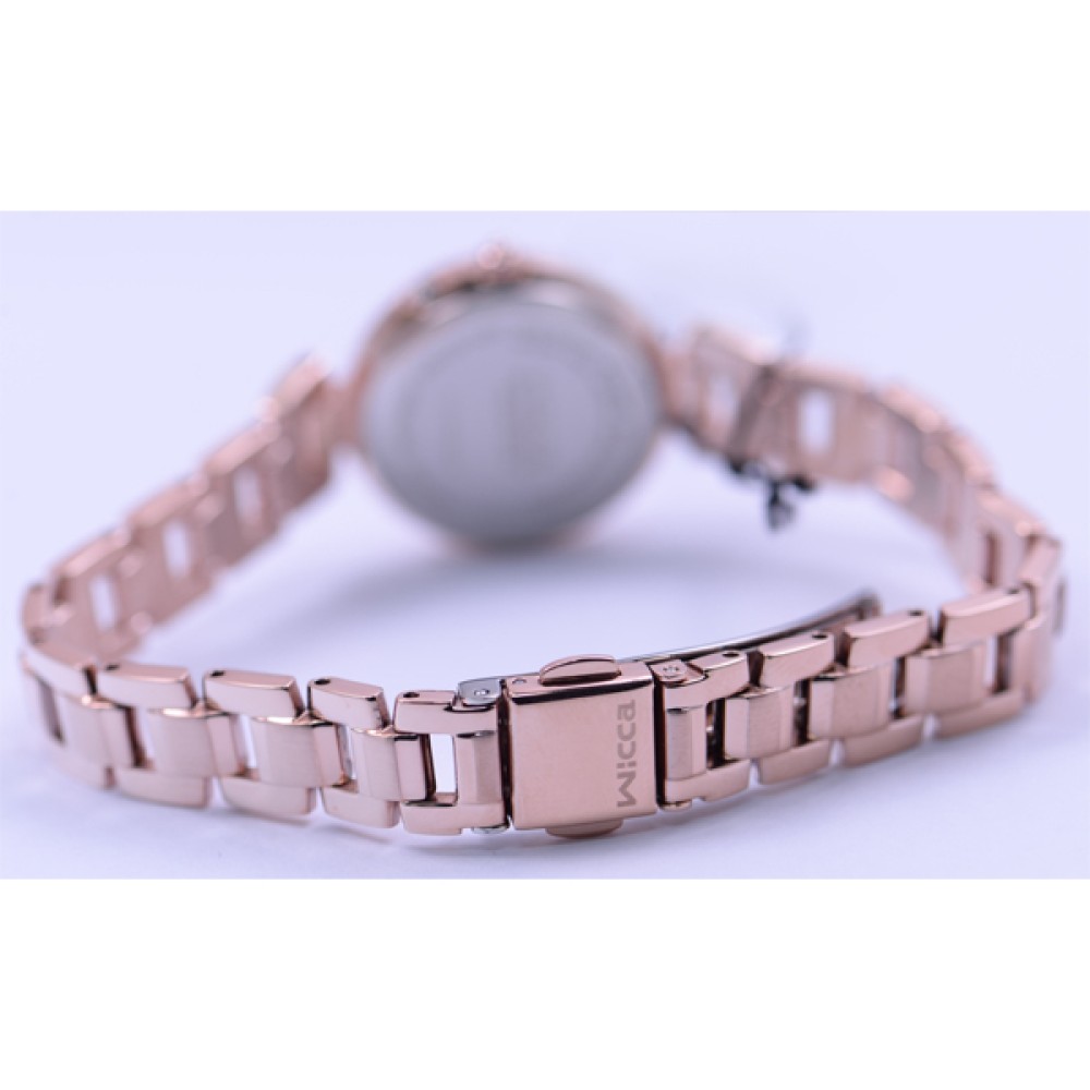CITIZEN WICCA KL0-669-11 - ladies watch made by Citizen. It has Japanese solar quartz movement and H0F8 calibre. Stainless steel, gold plated case of round shape. Case dimensions are 25.5 mm. in diameter and 7.2 mm. in thickness. The dial of this Citizen watch is silver, white. Display type: analog. This timepiece has mineral glass. Stainless steel, gold plated band, band color: gold. 50 m. water resistance. The watch is from Wicca collection. The following features are equipped: antimagnetic, date, perpetual calendar, radio controlled.