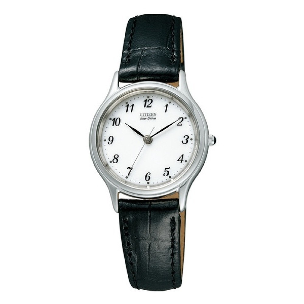 CITIZEN COLLECTION FRB36-2251 - ladies watch manufactured by Citizen. It has Japanese solar quartz movement and E031 calibre. Stainless steel case of round shape. Case dimensions are 26 mm. in diameter and 6.6 mm. in thickness. The dial of this Citizen watch is white. Display type: analog. This timepiece has sapphire, antireflection coating glass. Leather band, band color: black. 50 m. water resistance. The watch is from Eco-Drive collection. The following features are equipped: antimagnetic.
