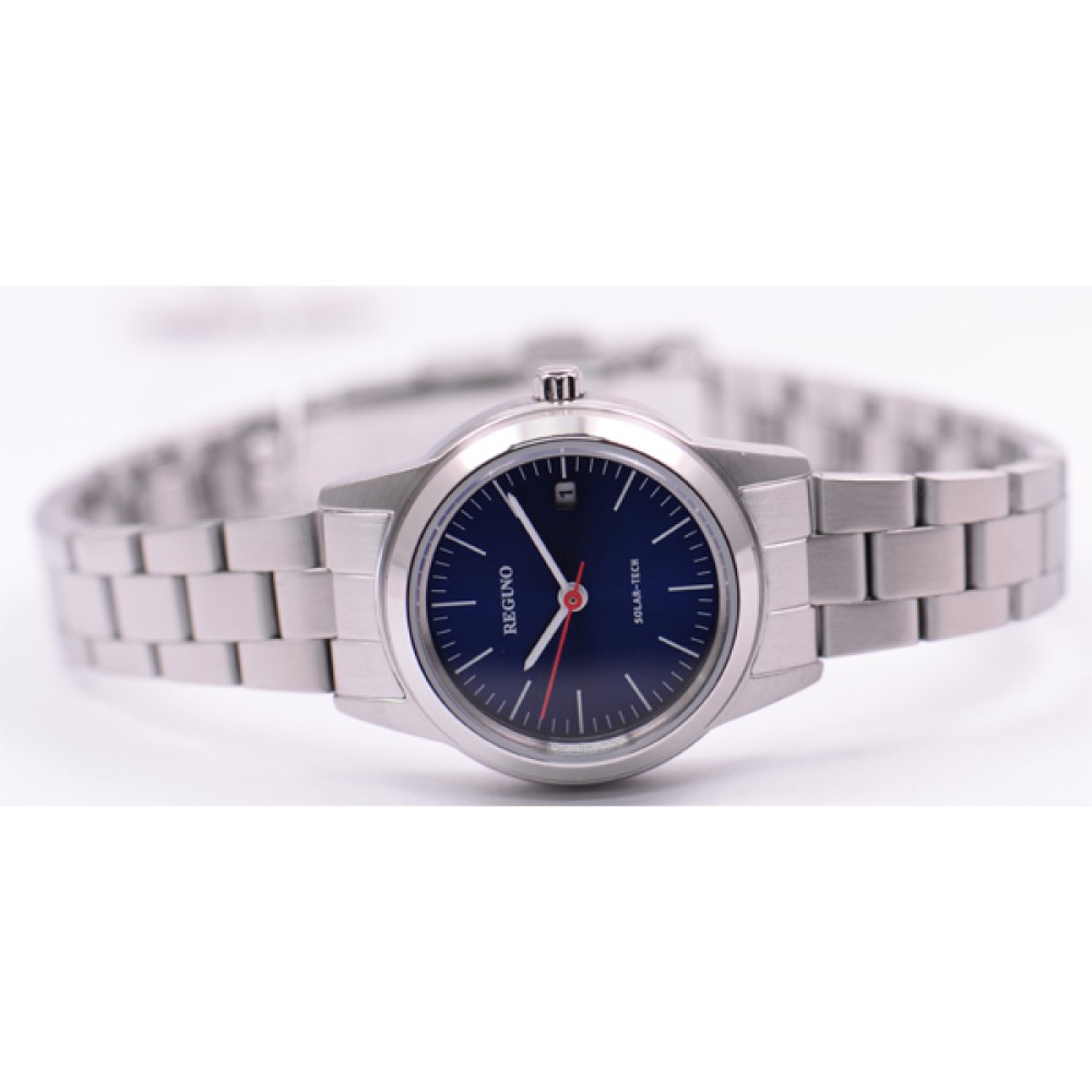 CITIZEN REGUNO KM4-015-71 - ladies watch manufactured by Citizen. It is equipped with Japanese solar quartz movement and J710 calibre. Stainless steel case of round shape. Case dimensions are 27.4 mm. in diameter and 8.7 mm. in thickness. The dial of this Citizen watch is blue. Display type: analog. This timepiece has mineral glass. Stainless steel band, band color: silver. 50 m. water resistance. The watch is from Citizen Reguno collection. The following features are equipped: date.