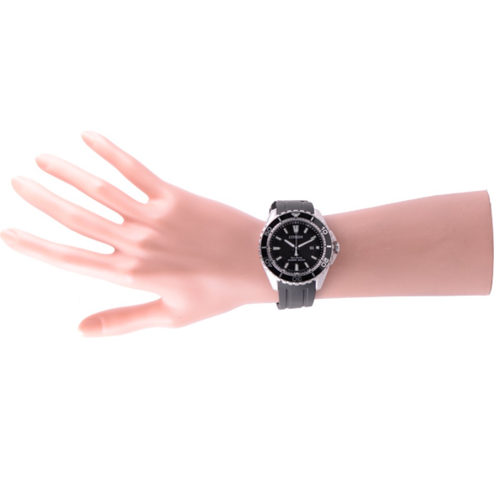 CITIZEN PROMASTER BN0190-15E - men's watch produced by Citizen. It is equipped with Japanese solar quartz movement and E168 calibre. Stainless steel case of round shape. Case dimensions are 44.5 mm. in diameter and 12 mm. in thickness. The dial of this Citizen watch is black. Display type: analog. This timepiece has mineral, antireflection coating glass. Polymer band, band color: black. 200 m. water resistance. The watch is from Promaster collection. The following features are equipped: date, antimagnetic, glowing hands, glowing markers, screw-down crown.