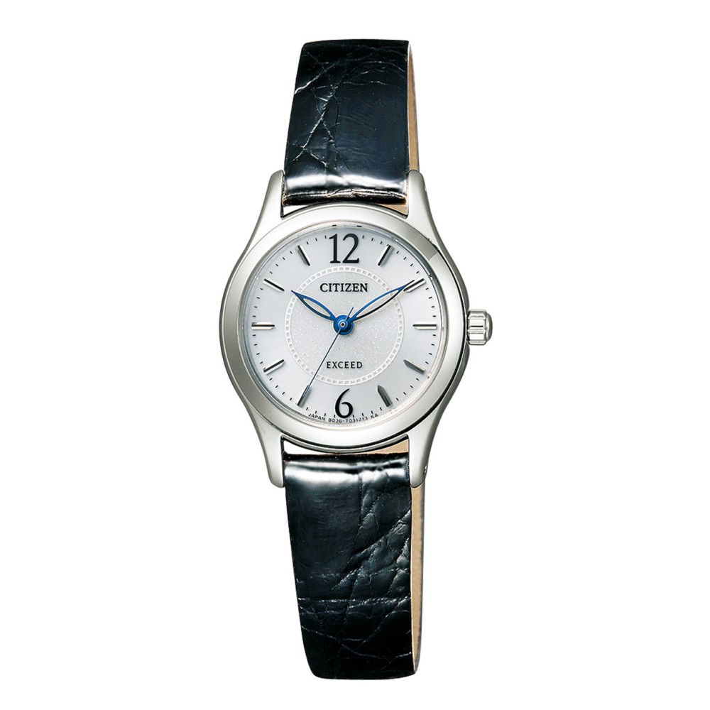 Citizen Exceed EX2060-07A - ladies watch manufactured by Citizen. It has Japanese solar quartz movement and B036 calibre. Stainless steel, hard coating case of round shape. Case dimensions are 24.5 mm. in diameter and 7.3 mm. in thickness. The dial of this Citizen watch is silver. Display type: analog. This timepiece has sapphire, antireflection coating glass. Crocodile band, band color: black. 50 m. water resistance. The watch is from Exceed collection. The following features are equipped: antimagnetic.