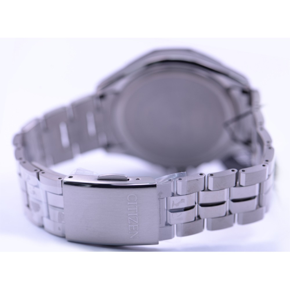 CITIZEN ATTESA AT9096-57E - men's watch made by Citizen. It is equipped with Japanese solar quartz movement and H820 calibre. Titanium, hard coating case of round shape. Case dimensions are 42.7 mm. in diameter and 10.8 mm. in thickness. The dial of this Citizen watch is black. Display type: analog. This timepiece has sapphire, super clear coating glass. Titanium, hard coating band, band color: silver. 100 m. water resistance. The watch is from Attesa collection. The following features are equipped: radio controlled, date, day, perpetual calendar, glowing hands, glowing markers, antimagnetic, world time, alarm, dual time, power reserve indicator.
