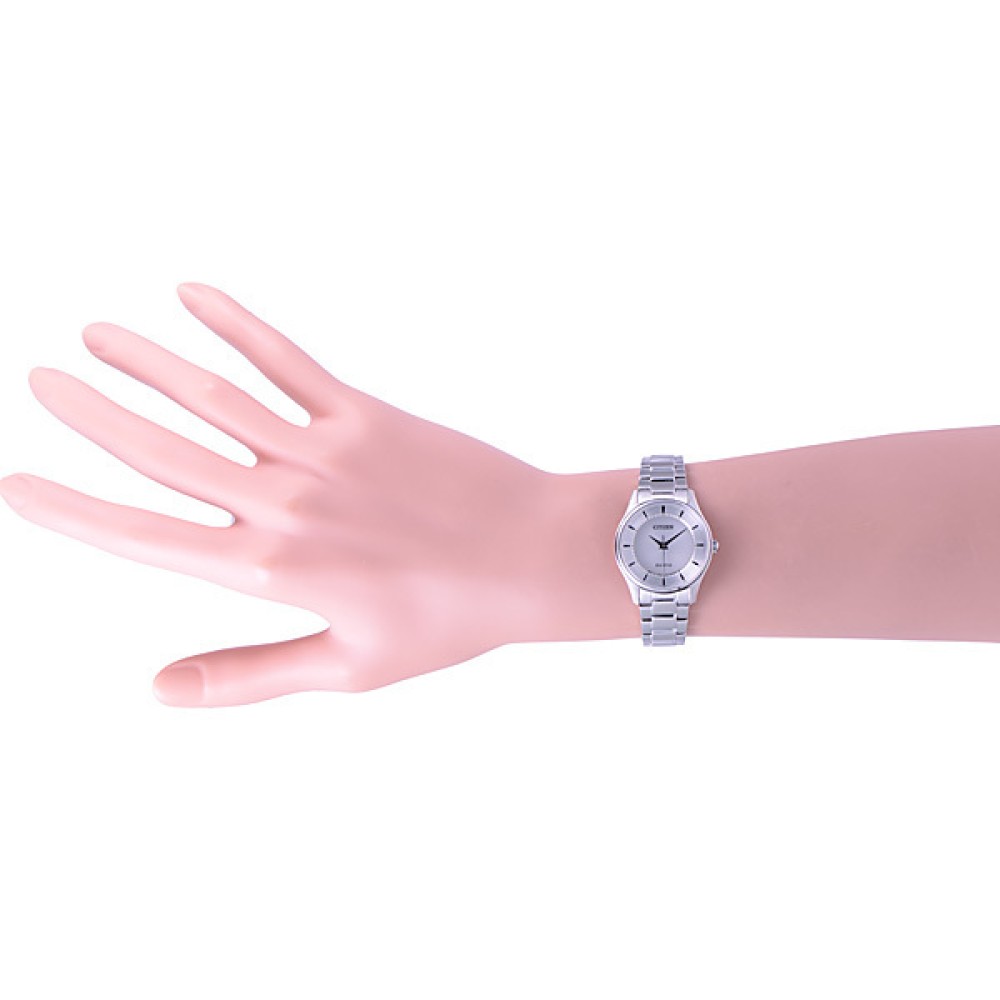 CITIZEN COLLECTION EM0400-51A - ladies watch manufactured by Citizen. It has Japanese solar quartz movement and E031 calibre. Stainless steel case of round shape. Case dimensions are 27.7 mm. in diameter and 7.1 mm. in thickness. The dial of this Citizen watch is silver. Display type: analog. This timepiece has sapphire glass. Stainless steel band, band color: silver. 50 m. water resistance. The watch is from Citizen Collection collection.